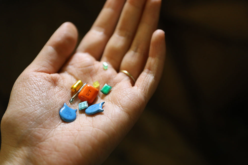 Merging traditional silversmithing with digital fabrication, Chen sets e-waste components, including tiny diodes and vintage capacitors into silver mounts.